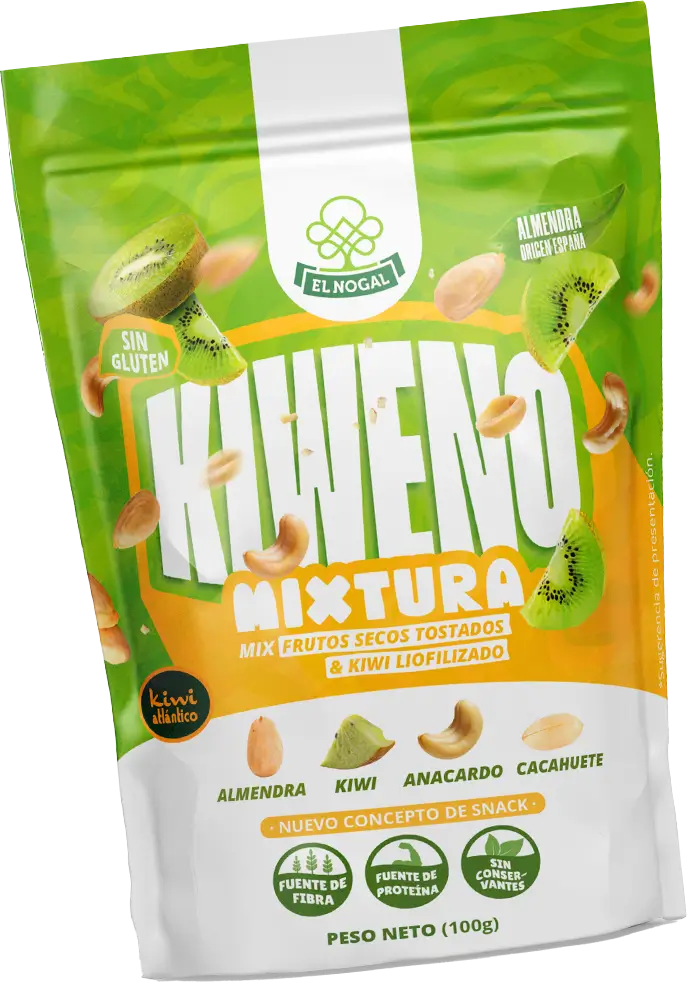 KIWENO – El mix que une lo natural, lo bueno y lo innovador. Snack funcional a base de frutos secos totados en su punto optimo y kiwi liofilizado, proyecto de cobranding con Kiwi Atlántico.